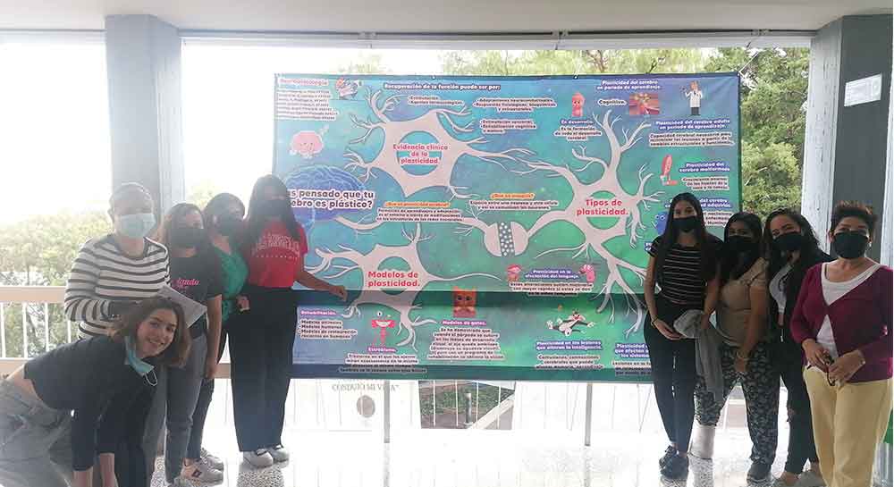 Dicha actividad la realizaron 42 estudiantes de quinto semestre de la carrera en Psicología, quienes prepararon conjuntamente diferentes carteles que en colaboración forman un gran mural sobre la neuroplasticidad.
