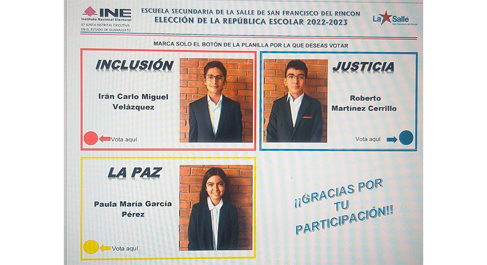 Como parte de la materia de Formación Cívica y Ética, estudiantes de secundaria del Campus San Francisco del Rincón de la Universidad De La Salle Bajío participaron en las elecciones del nuevo Comité de Estudiantes: “República Escolar”, con la finalidad de fomentar los derechos ciudadanos.