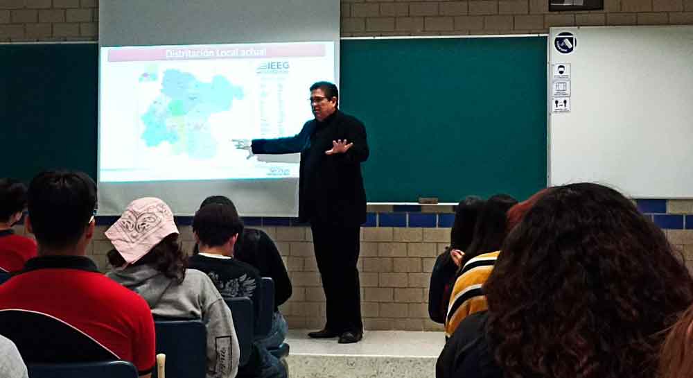 Durante su intervención, el ponente dio a conocer cómo están distribuidos los Distritos en el Estado de Guanajuato y sus municipios; Además, explicó cómo se eligen a los diputados y cuántos representan a cada municipio según el número de habitantes.