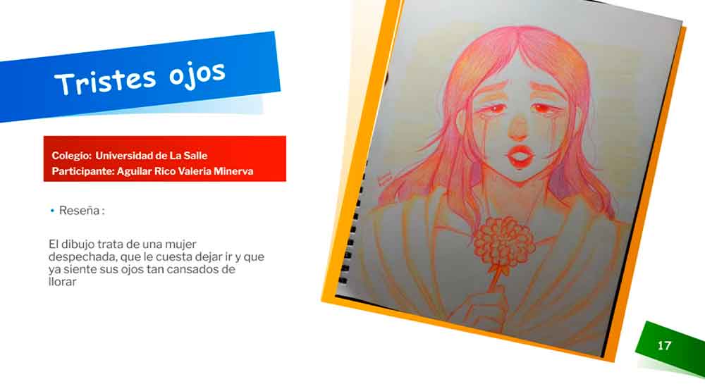 “Pienso que mi esfuerzo y dedicación valió la pena, me llena de orgullo y satisfacción saber que, en los próximos proyectos puedo alcanzar la meta deseada y aumentar mi confianza y experiencia para seguir aprendiendo, agradezco mucho la oportunidad y confianza que pusieron en mí y sé que vienen más proyectos”, comentó Luis Quiroz, ganador del 2do lugar en dibujo.