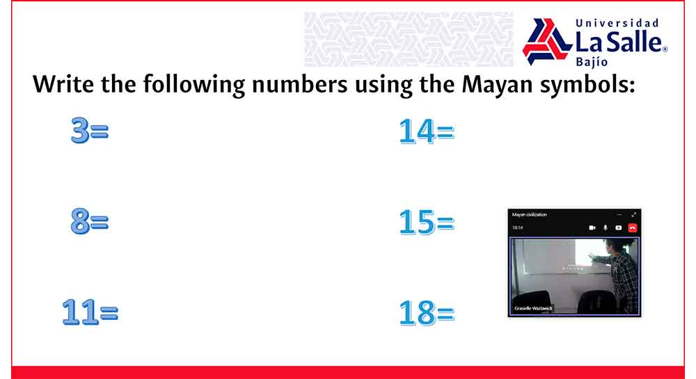 La dinámica consistió en que los estudiantes previamente tuvieron información por parte de sus docentes y se reforzaron 10 hechos o realidades de la cultura maya durante la sesión. El sistema de numeración Maya fue el foco principal, se expusieron los símbolos utilizados y el orden, en el cual deben presentarse, así como similitudes y diferencias con el sistema de numeración actual.