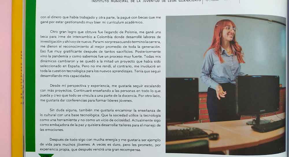 Esta acción tuvo como objetivo lanzar la primera edición del libro “León es joven, retratos de trayectorias & diversidad juvenil” donde se reconoce la trayectoria e historias de vida de 50 jóvenes de la ciudad, en las áreas de Bienestar, Deporte, Arte y Cultura, Labor Social, Emprendimiento y Educación, cuyos proyectos han sido de alto impacto en la sociedad y del que la Lic. Beatriz es parte.