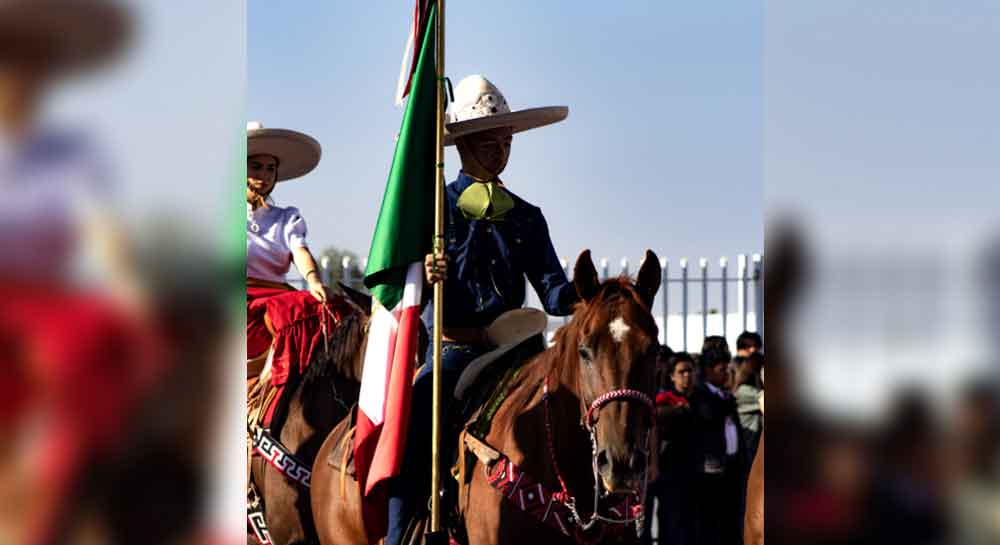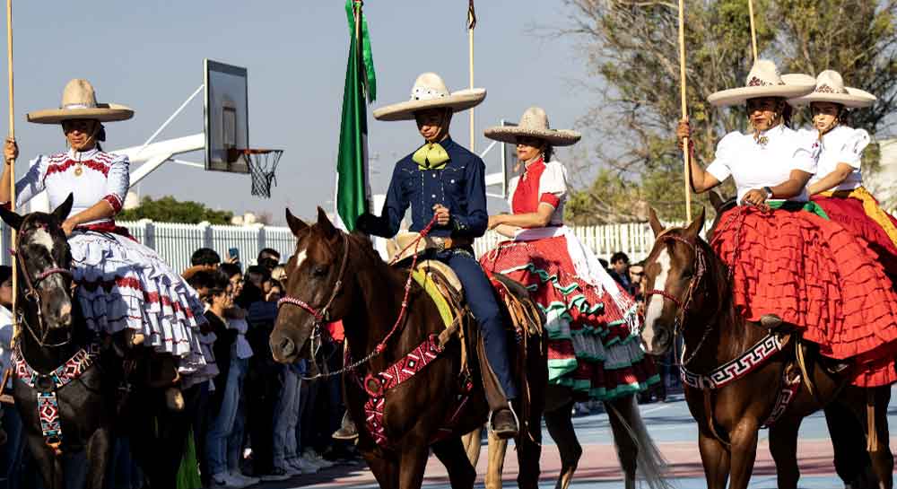 Los grupos de la preparatoria se congregaron en las canchas deportivas de la institución para dar la bienvenida a la bandera de México, portada con honor por una escolta a caballo compuesta por escaramuzas y charros. El ambiente se llenó de emoción y respeto al son de los tambores y cornetas de la banda de guerra institucional, mientras la escolta a caballo desfilaba alrededor de las cuatro canchas deportivas, saludando a la bandera. Estudiantes, docentes y administrativos presenciaron con orgullo la marcha del lábaro patrio.