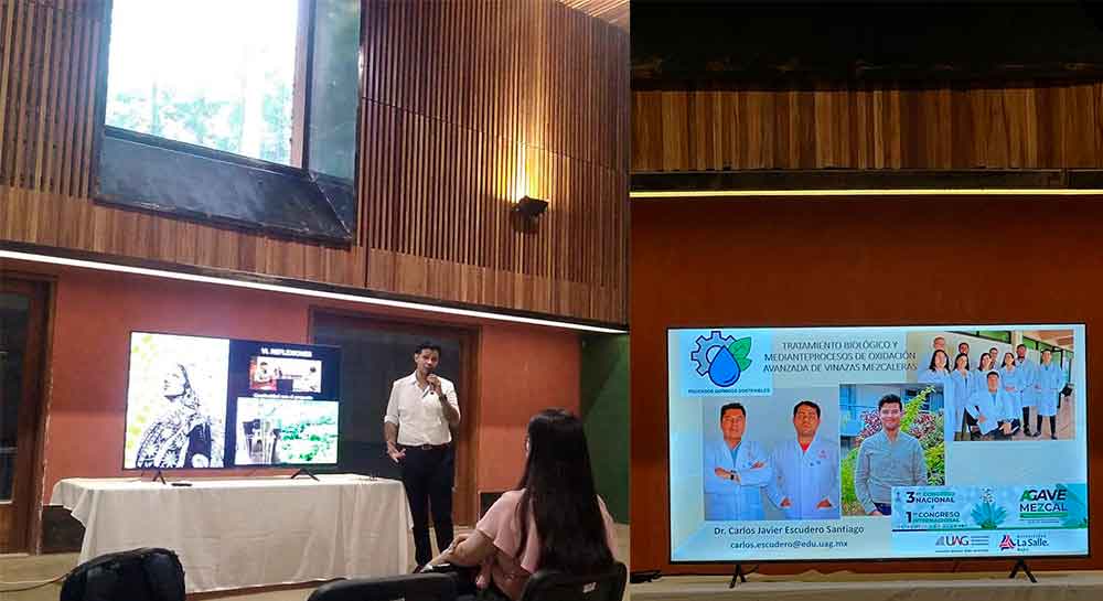 El Profesor Investigador, Dr. Raúl Gómez Vázquez, de la Facultad de Turismo y Gastronomía de la Universidad La Salle Bajío, en colaboración con el Dr. Carlos Javier Escudero Santiago, Profesor-Investigador del Departamento de Biotecnológicas y Ambientales de la Universidad Autónoma de Guadalajara (UAG), presentaron dos investigaciones innovadoras en el Tercer Congreso Nacional y Primer Congreso Internacional de Agave Mezcal. Este evento se llevó a cabo en la ciudad de Oaxaca de Juárez y reunió a expertos de todo el país en torno a la producción de mezcal y la gestión de subproductos, como las vinazas.
