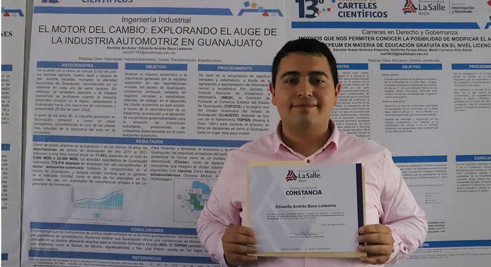 · Ingeniería y Tecnología: Eduardo Andrés Baca Ledesma de la Carrera en Ingeniería Industrial con el Cartel “El motor del cambio: Explorando el auge de la industria automotriz en Guanajuato”. Obteniendo el segundo lugar.