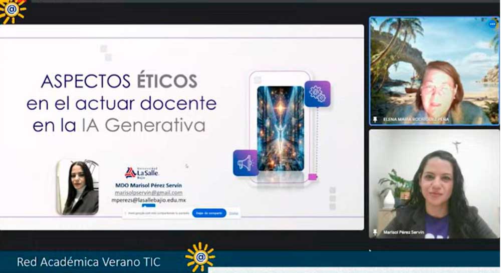 Pero las actividades lasallistas trascendieron fronteras, ya que la Maestra Marisol Pérez Servin, Coordinadora Administrativa de la Facultad de Ingenierías y Tecnologías, impartió la videoconferencia “Aspectos Éticos en el actuar Docente en la Inteligencia Artificial Generativa” a personas del Centro Regional Universitario de Barú, de la Universidad Autónoma de Chiriquí, en Panamá; en el que también participaron académicos de Bolivia, Guatemala, Argentina, Costa Rica, México, El Salvador, Colombia, Perú, Ecuador, entre otros Países Latinoamericanos.