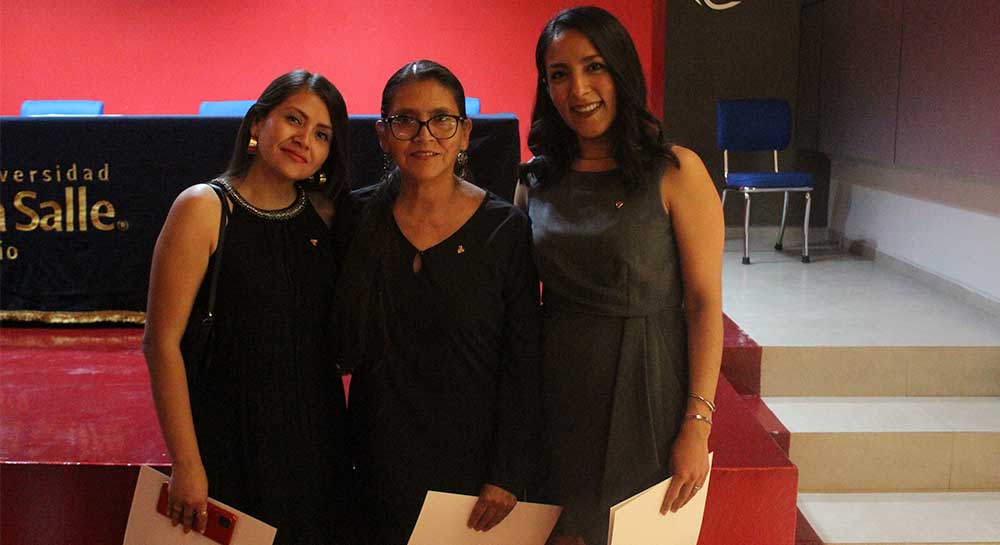 El escudo Lasallista, se compone por 6 chevrones entrelazados que representan: tres funciones sustantivas; la docencia, investigación y extensión. “Hoy es un buen momento para que, estando juntos nuevamente, puedas ponértelo y lo ubiques lo más cerca de tu corazón. Te pido ponerte de pie y colocar tu insignia lo más cercano a tu corazón”, destacó la Mtra. Ma. Socorro Durán González.