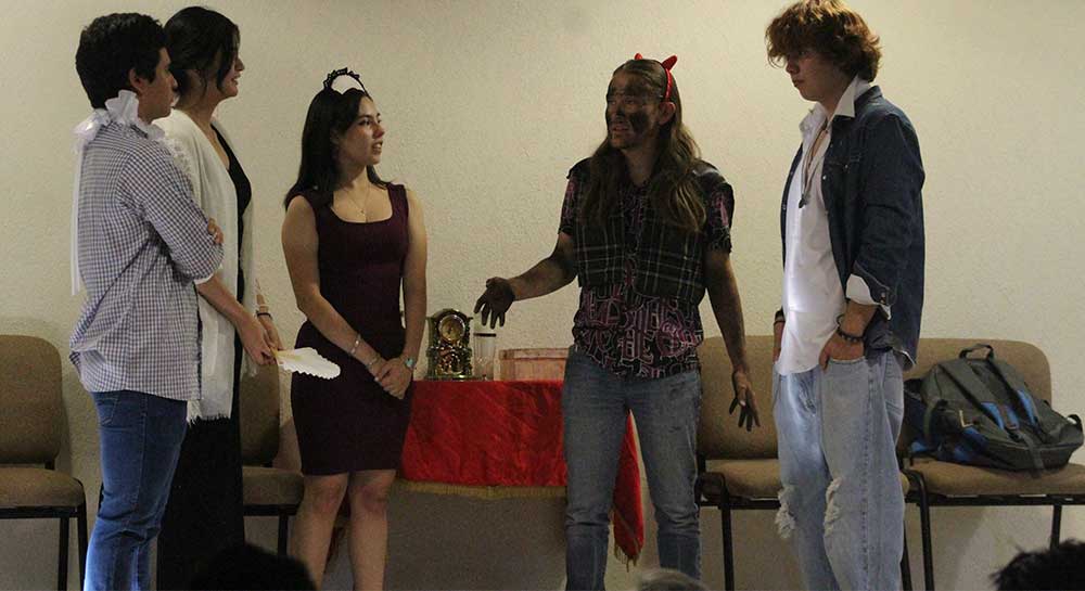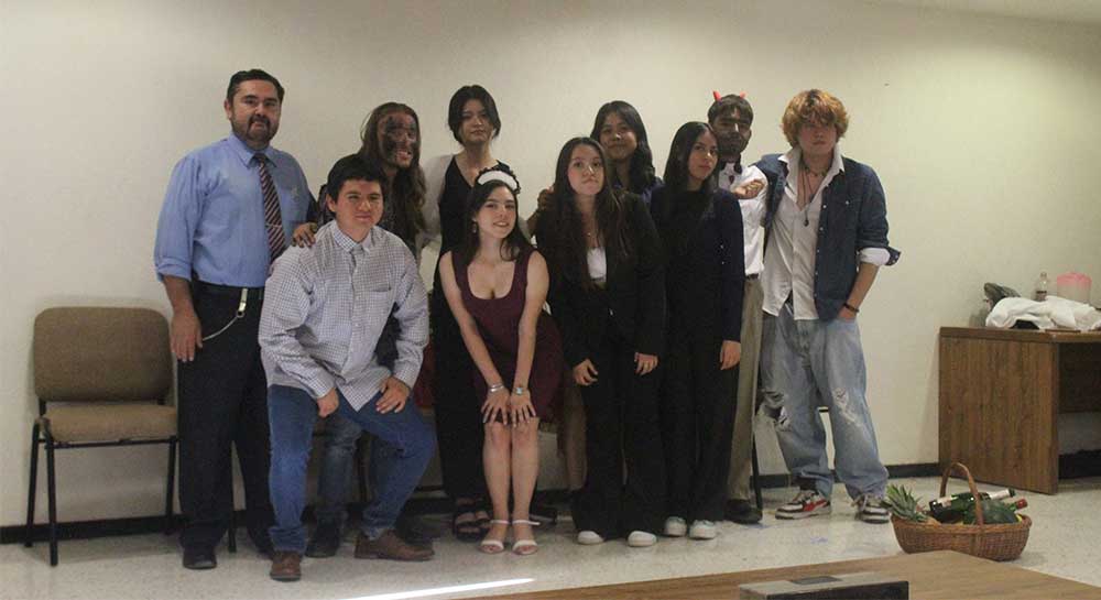 El Aula B002, fue testigo de esta ocurrente obra donde los alumnos Sebastián Arreguín Villanueva, Sage Antonio Bermúdez Rayón, Diana Lizbeth Contreras Tejeda, Mariel González Nieto, Andrea González Valdivia, Vania Elisheba Juárez Hernández, Víctor Manuel Ortiz Vega, Dasha Fernanda Vega Barrera, Megan Romina Zúñiga Hernández, Gerardo Gabriel Parada Salazar y José Alfredo Martínez Gutiérrez, deleitaron a los asistentes con sus divertidas actuaciones.