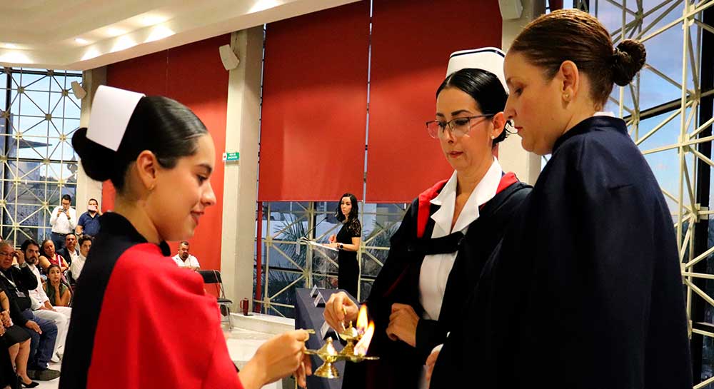 “Estamos reunidos para llevar a cabo un acto muy significativo en la licenciatura de enfermería que es el paso de la luz, el cual tiene su origen en la vida y obra de Florence Nightingale, también llamada la dama de la lámpara, quien llevó la luz a los heridos en la Guerra de Crimea. El paso de la luz significa la transmisión del conocimiento, los valores y principios éticos, los cuales van a guiar y conducir su vida profesional”, detalló.