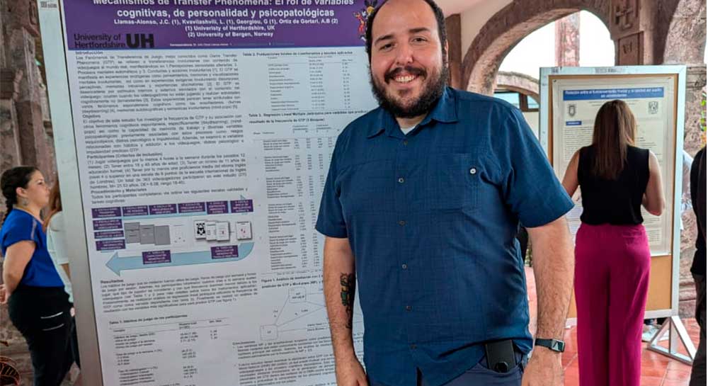 En tanto, el doctor Llamas Alonso, docente de la Facultad de Ciencias Sociales y Humanidades, presentó su cartel titulado "Mecanismos de Game Transfer Phenomena: El rol de variables cognitivas, de personalidad y psicopatológicas" producto de su trabajo de doctorado en University of Hertfordshire en el Reino Unido.