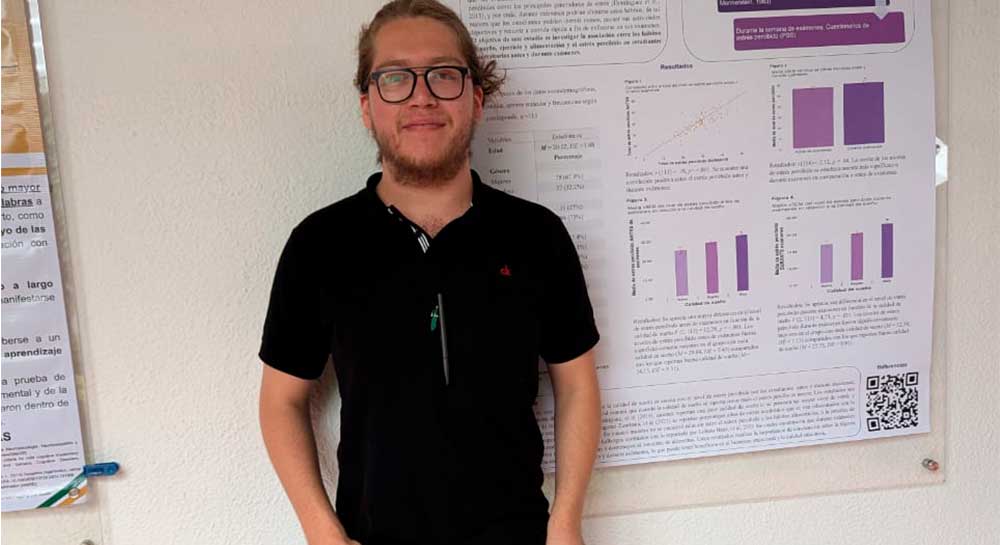 Óscar Uriel Castillo, de la Licenciatura en Psicología, presentó su cartel titulado "Asociación entre hábitos y estrés en estudiantes universitarios antes y durante exámenes", derivado de su participación en un proyecto de investigación con la Dra. Mayra Linné Almanza Sepúlveda sobre la “Asociación entre el estrés percibido y el rendimiento académico: el papel mediador del cortisol y las tensiones musculoesqueléticas en los estudiantes universitarios de La Salle Bajío”.