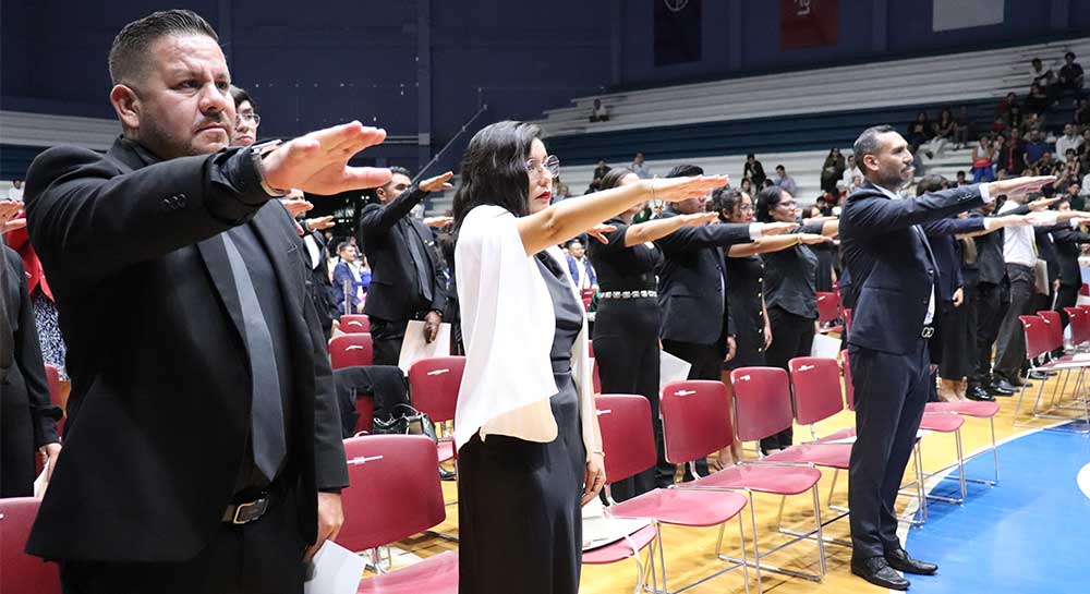 Asimismo, el doctor González Álvarez tomó protesta a las y los titulados, quienes con el brazo derecho extendido en señal de juramento, se comprometieron a “cumplir fiel y lealmente los deberes propios de la profesión”.