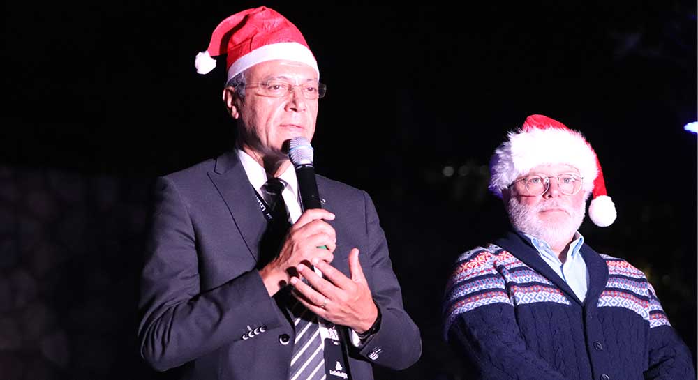 Finalmente, el momento más esperado de la noche llegó. El Rector, en compañía de la mascota Felino, tras la cuenta regresiva presionó el botón de encendido con el que se encendió el monumental pino navideño decorado con la insignia lasallista.