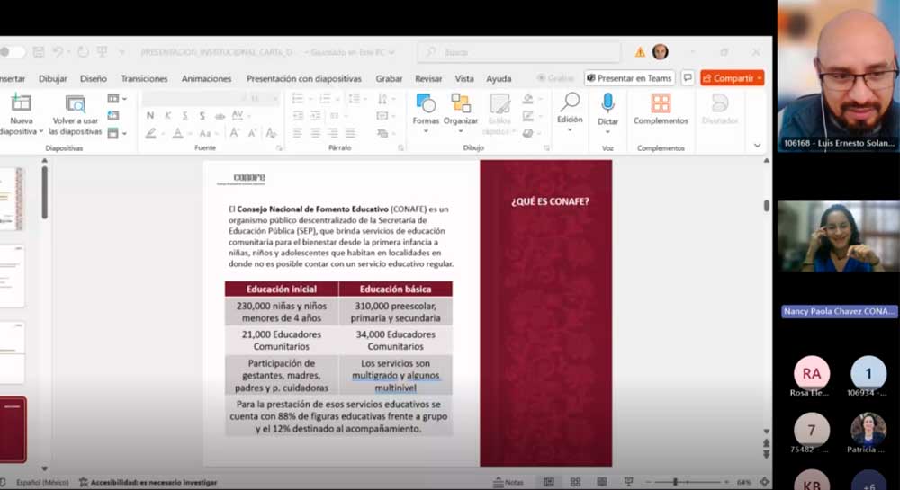 La primera charla, a cargo de la Dra. Chávez, explicó el Modelo de Educación Comunitaria del Consejo Nacional de Fomento Educativo (Conafe), cuyo núcleo se centra en la relación tutora. Se trata de un sistema cara a cara en el que se privilegian las redes de tutorías en el proceso de enseñanza-aprendizaje. Bajo este esquema y sus seis principios pedagógicos (entre ellos, ritmo de aprendizaje y respeto a la construcción del conocimiento) es que este modelo ha logrado resultados significativos en las comunidades debido a que refuerza la conexión humana. El papel del educador también es importante porque debe conocer las prácticas y los elementos culturales y de identidad en donde participa.