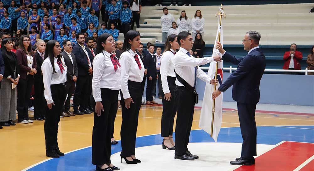 El acto protocolario fue presidido por el Hno. Roberto Medina Luna Anaya, la Mtra. Ma. Socorro Durán González y la Mtra. Martha Elena Bermúdez Funes, encabezados por el Rector, Hno. Enrique Alejandro González Álvarez,quien entregó la enseña a Emiliano Manrique Saldaña, del grupo de Centros Comunitarios, quien escoltado por compañeras de diversos grupos representativos la recibió con orgullo y quedó sellado el compromiso de llevar en alto los valores de la institución.