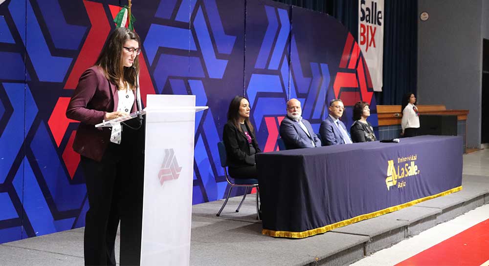 Acto seguido, el turno de la palabra correspondió a María Giordana Jiménez Sahuaya, egresada de la generación 2021, quien en su mensaje recordó cómo su paso por el equipo de fútbol femenil le enseñó disciplina y liderazgo, virtudes que hoy aplica en su labor de prevención social con niños y jóvenes en contextos vulnerables.
