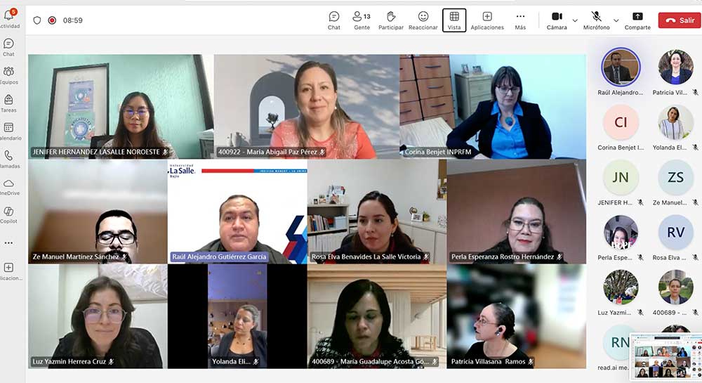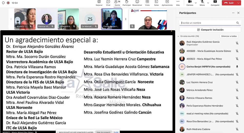 La Dra. Corina Benjet, reconocida investigadora del Instituto Nacional de Psiquiatría Ramón de la Fuente Muñiz y líder del proyecto, presentó los resultados ante autoridades educativas, entre ellas la Dra. Patricia Villasana Ramos, Directora de Investigación y Doctorado; la Mtra. Perla Esperanza Rostro Hernández, Directora de la Facultad de Estudios Superiores del Campus Salamanca; la Mtra. Yolanda Elizeth Sotelo Texta, Secretaria Académica de la Facultad de Estudios Superiores; y el Mtro. Ze Manuel Martínez Sánchez, Coordinador del área de Ciencias Sociales y Humanidades del Campus Salamanca, además de orientadoras y personal del Departamento de Desarrollo Docente y Estudiantil que fungieron como enlaces del proyecto. La sesión fue moderada por la Mtra. María Abigail Paz Pérez, Enlace de la Red La Salle México, y el Dr. Raúl Alejandro Gutiérrez García, Investigador de Tiempo Completo del Campus Salamanca.