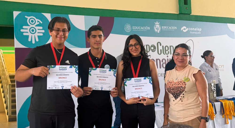 Los proyectos Raíz de Vida y Falso Pastor obtuvieron una medalla de bronce cada uno, mientras que Exploración de hongos entomopatógenos nativos del Bajío de Guanajuato asociados a Spodoptera frugiperda se llevó la medalla de platino, la cual otorga a sus creadores —Adrián Almanza, Paula Alvarado y Luis Ortiz Arévalo— el pase directo a la ExpoCiencias Internacional Costa Rica 2026.