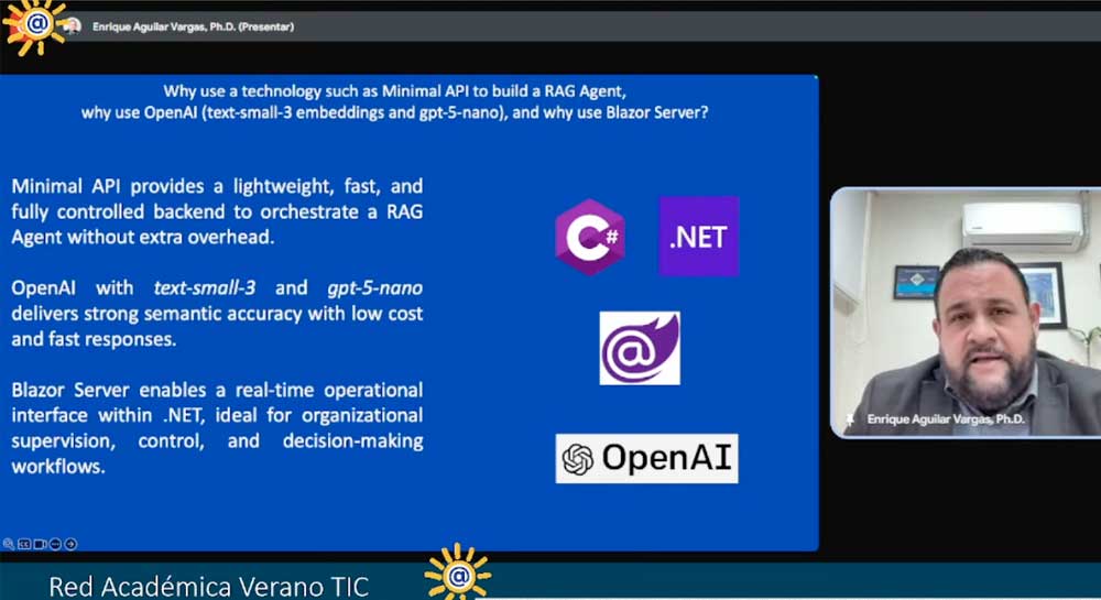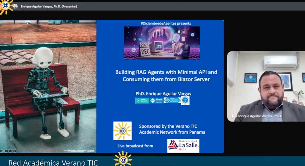 El director de la Facultad de Ingenierías y Tecnologías de la Universidad La Salle Bajío, el Dr. Enrique Aguilar Vargas, impartió la videoconferencia Construcción de Agentes RAG con Minimal API y consumo desde Blazor, como parte del encuentro de Agentes, organizado por el Dr. Luis Antonio Beltrán, de la Universidad Tomás Bata, en Zlín, República Checa.