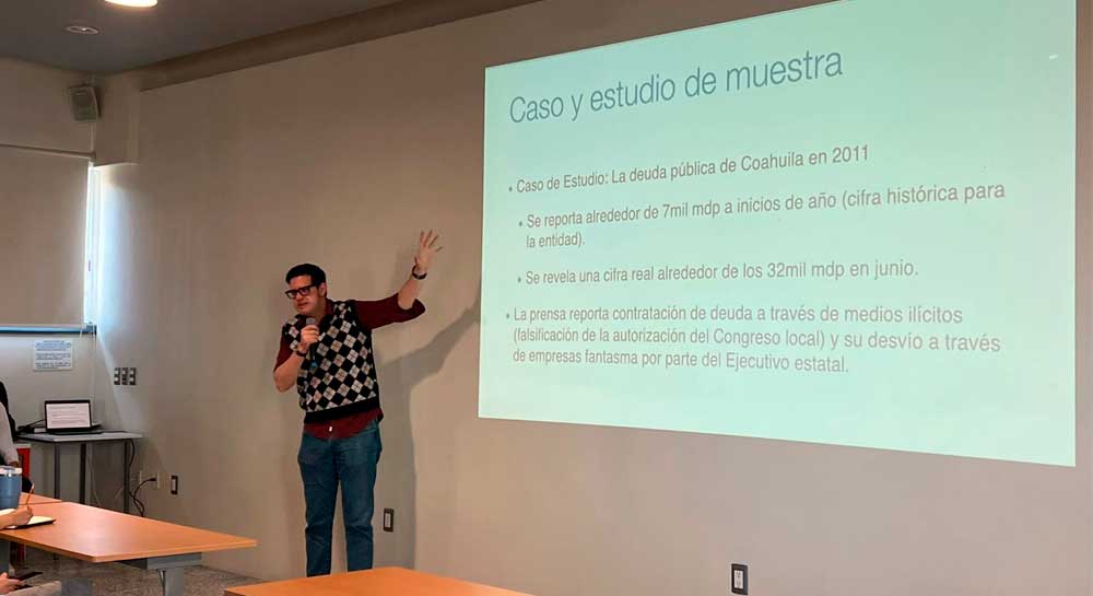 La presentación del Dr. Mario Joel abordó el caso de la deuda pública de Coahuila y comparó la cobertura mediática en dos medios de comunicación: uno generalista, Reforma; y uno especializado, El Financiero. Su estudio es una muestra de trabajo interdisciplinario, al vincular líneas de investigación de la comunicación y la ciencia política, para aportar elementos a la comprensión del papel de los medios de comunicación en la rendición de cuentas y la discusión de los asuntos públicos.