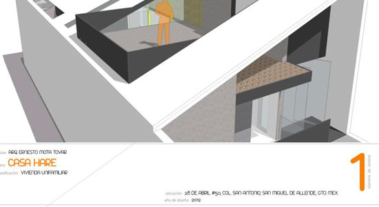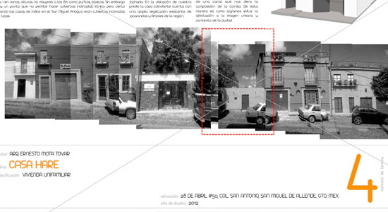En la modalidad de Vivienda Unifamiliar, el Arquitecto Ernesto Mota Tovar egresado de nuestra casa de estudios en abril del 2010participó con Casa Hare, un proyecto de casa-habitación en San Miguel de Allende, que llegó a sus manos con un mal estado de construcción, por lo que se optó por la demolición total de la vivienda. Luego de estudiar las necesidades de una joven familia conformada por tres integrantes, se decidió construir una casa sin jerarquías que permitiera potenciar la vida comunitaria, al mismo tiempo de mejorar la individualidad de cada habitante.